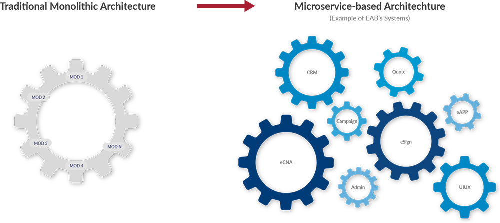 EAB adopts microservices in our application development, where a large application is built as a suite of modular services. Each module supports a specific business goal and uses a smaller, simple, manageable and well-defined interface to communicate with other sets of services.